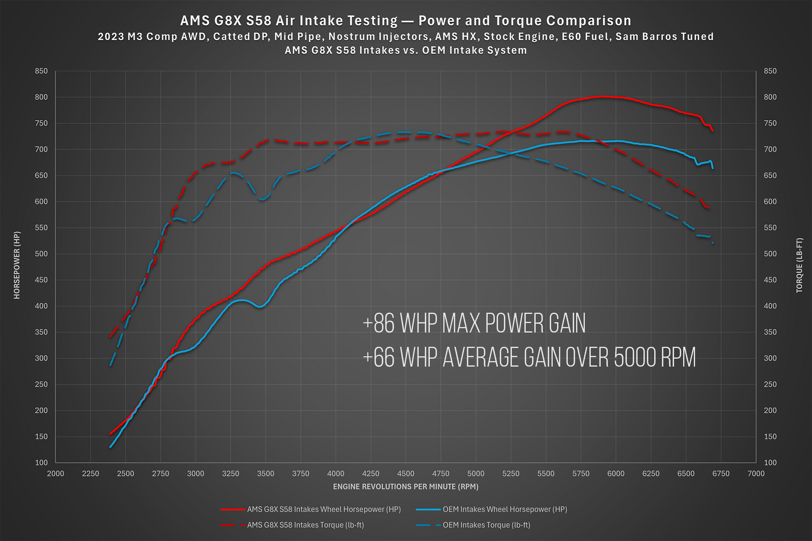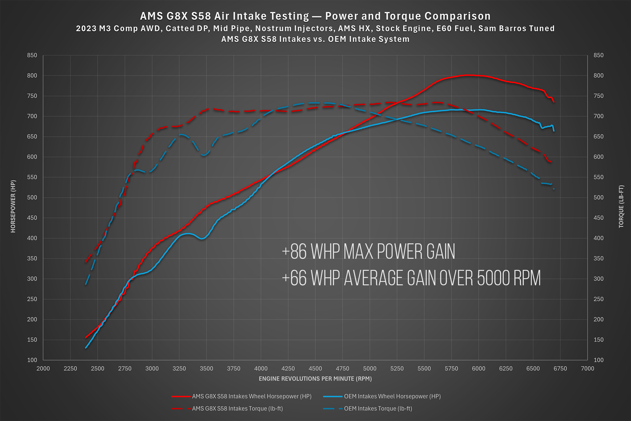 Proven horsepower gains: Up to +86 WHP peak and an average of +66 WHP above 5000 RPM in dyno testing, broadening the S58’s usable power band.