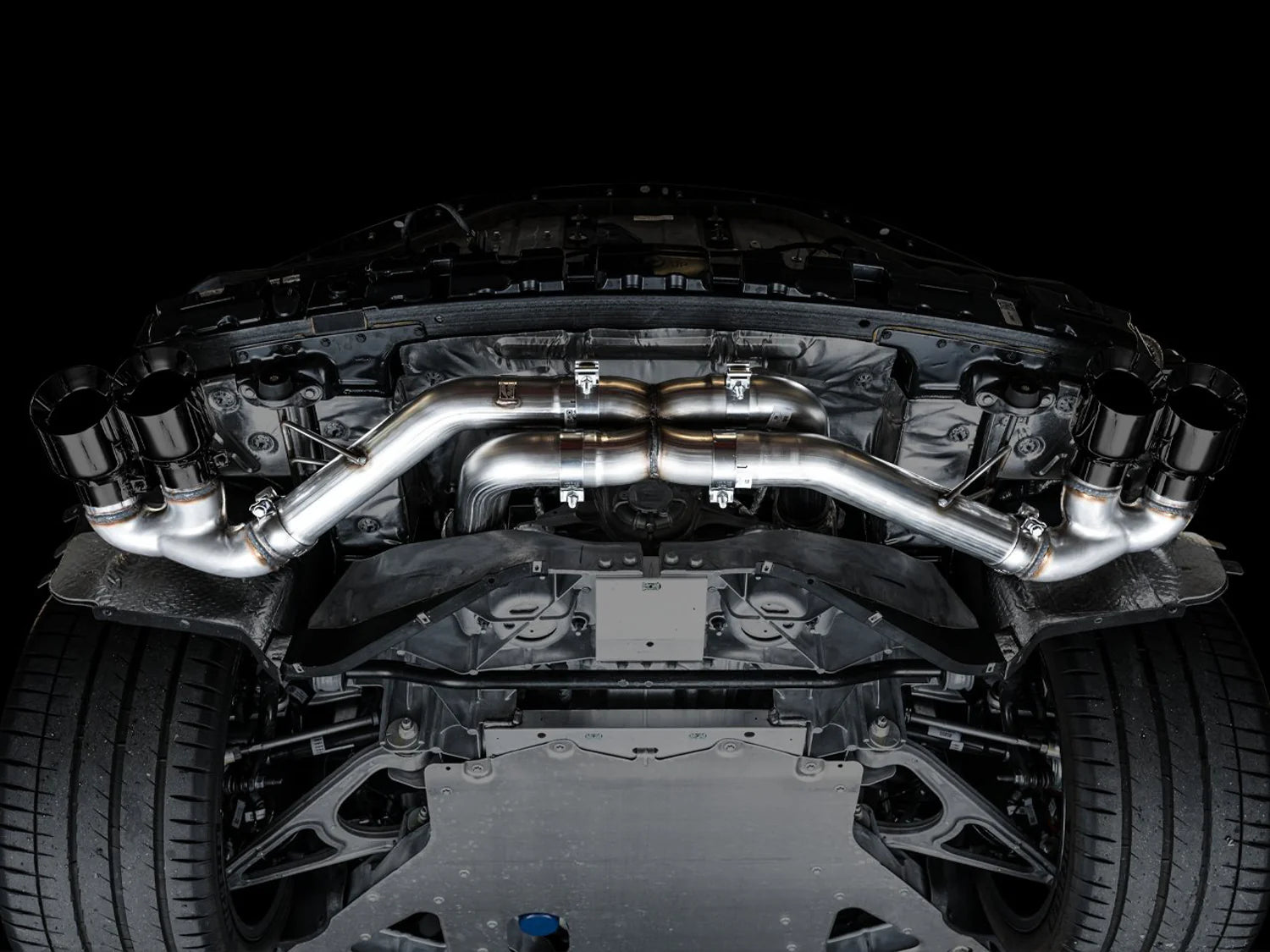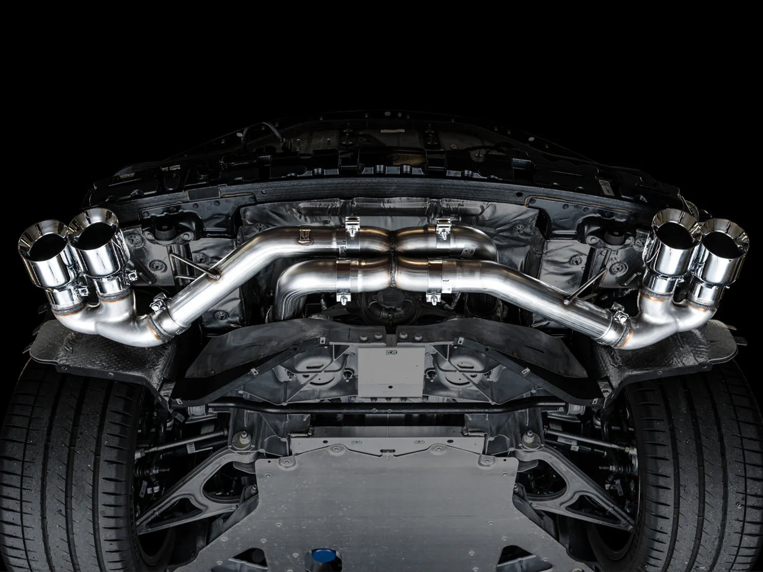 Complete Touring or Track Edition Exhaust, four 102mm double-walled tips in the desired finish, aluminum AWE heat shield, four AWE Valve Simulators, and all necessary hardware for installation.