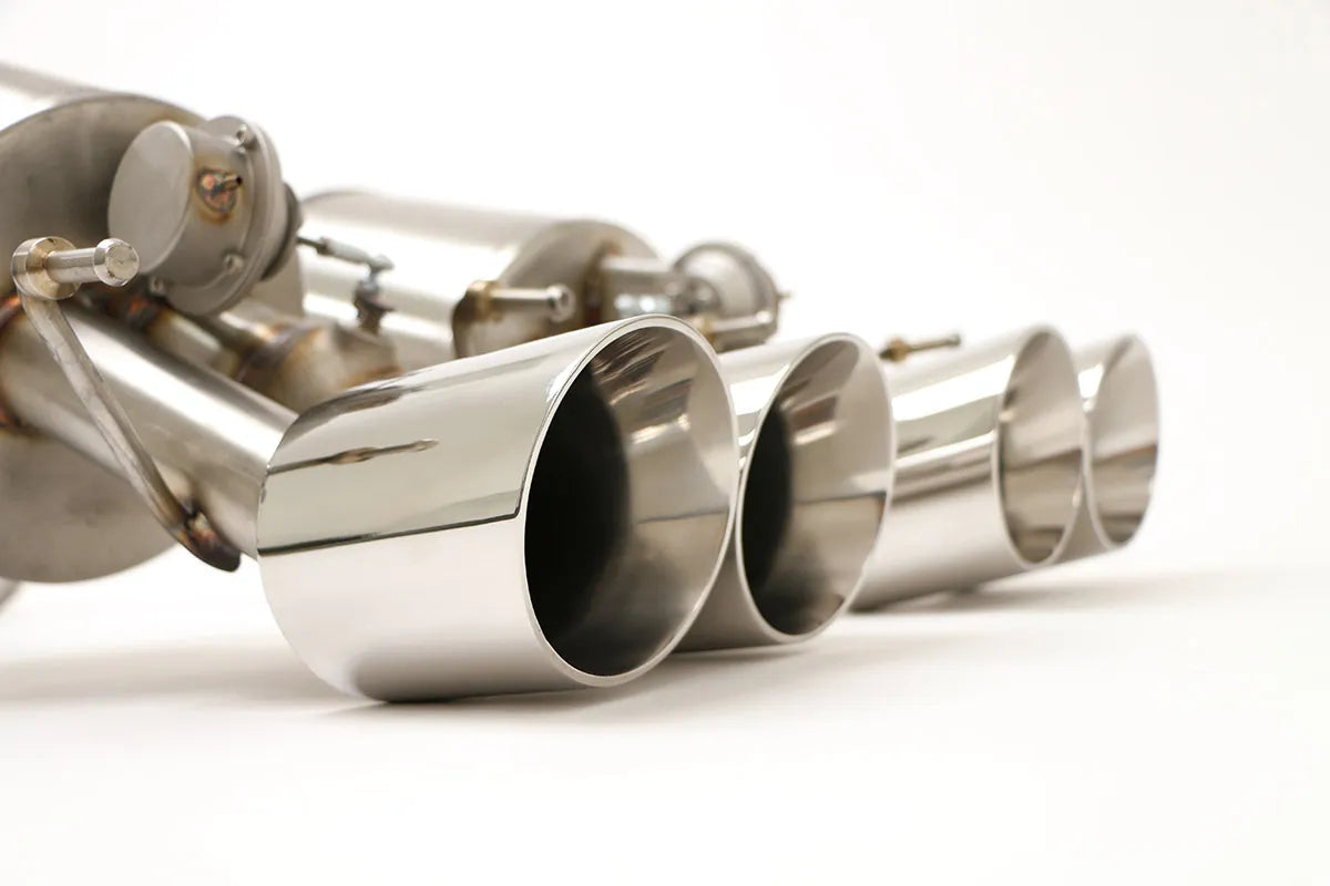 Quad 4″ round double-wall tips matched to C6 rear profile