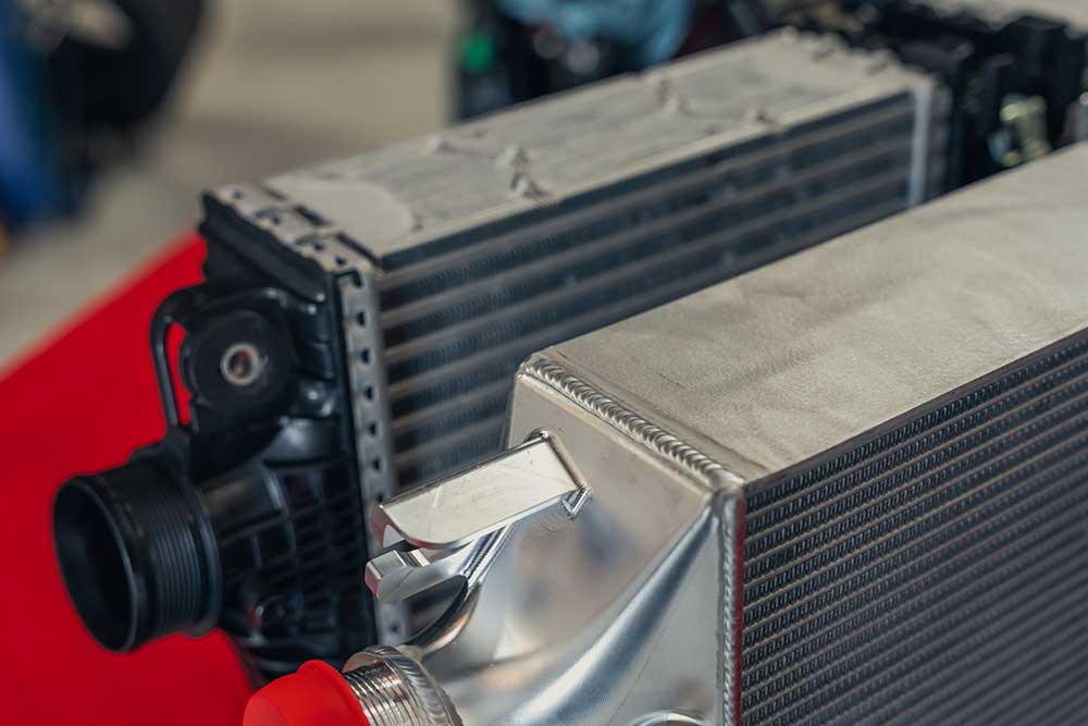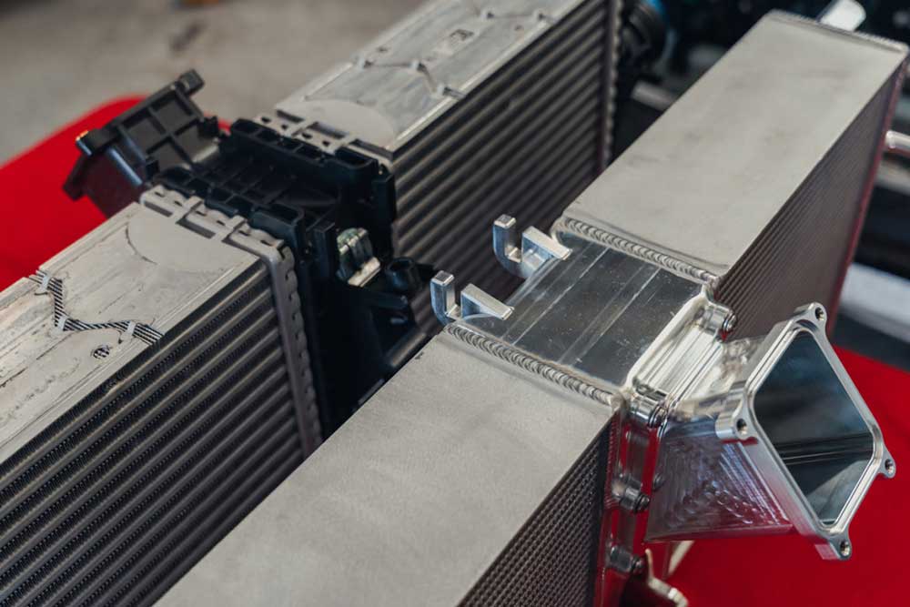 Massive cooling capacity — core 1.4× thickness of stock to fight heat soak even under aggressive tuning