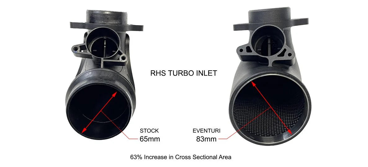 Turbo Inlet Increase: Up to 160% larger cross-section to reduce restriction and boost flow