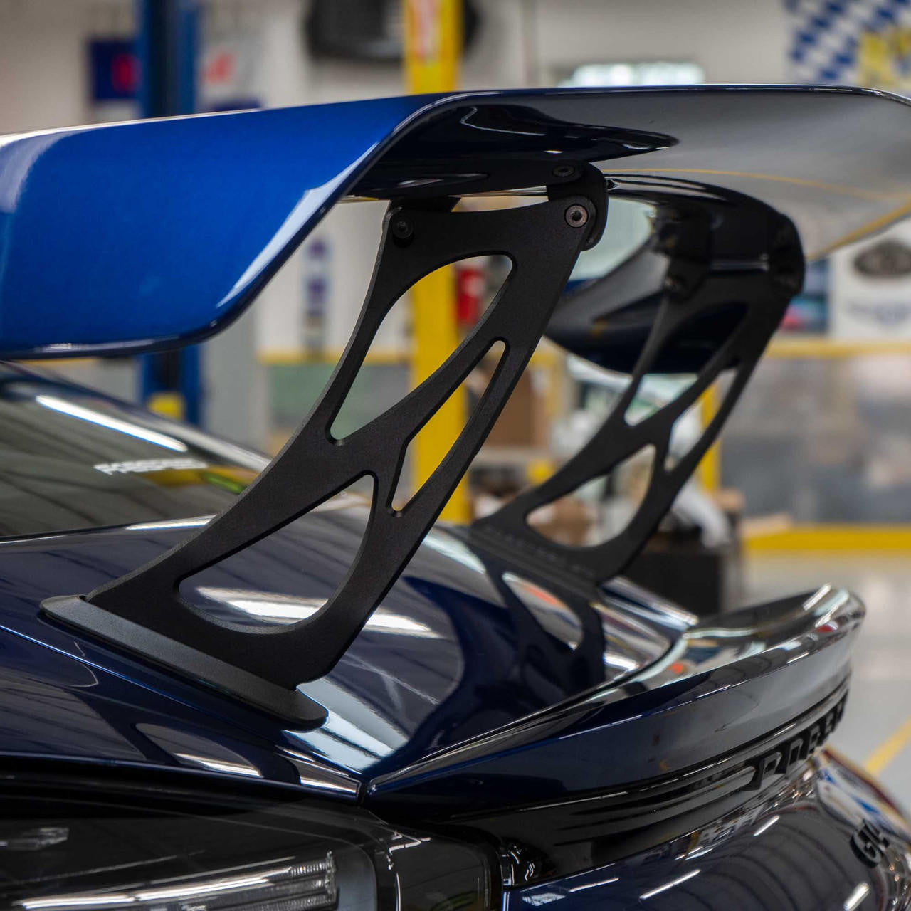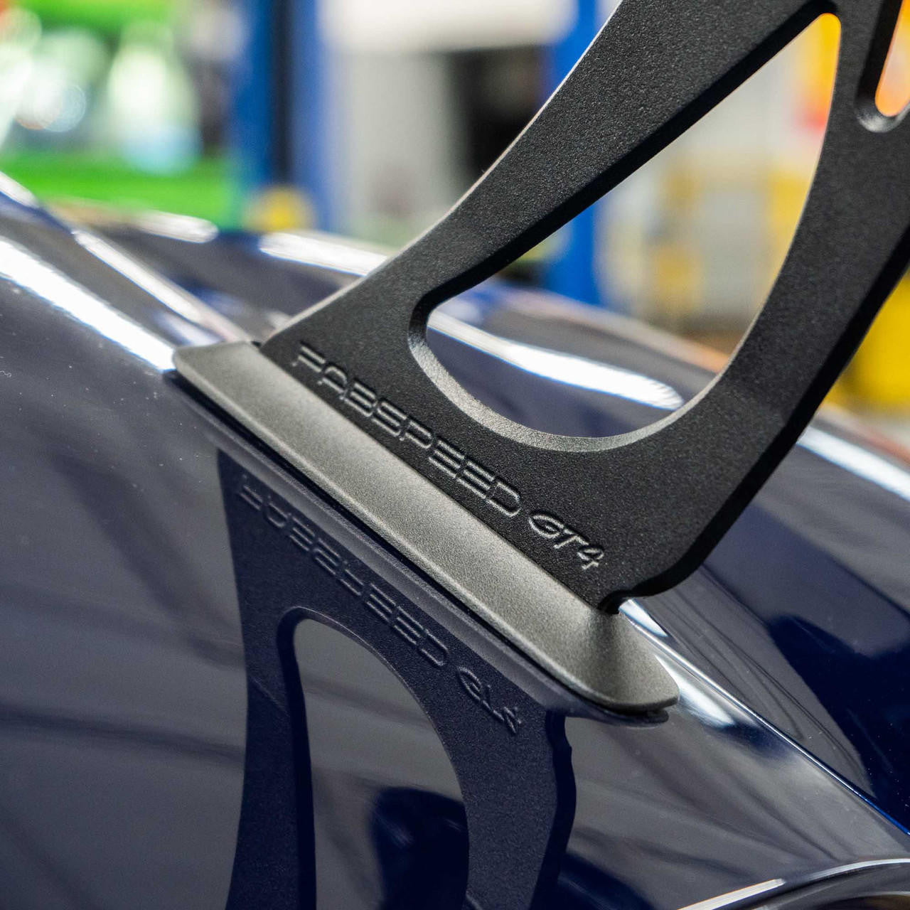 The Fabspeed Monoblock Wing Risers elevate and reposition your GT4’s rear wing to unlock improved aerodynamics, enhanced rear-visibility, and a more aggressive stance. CNC-machined from billet 6061-T6 aluminum, they lift the wing nearly 5.75" and shift it 1" rearwards — putting it into cleaner, higher-velocity airflow like a track-spec CUP-car wing. The result is greater rear downforce, sharper high-speed stability, and the kind of purposeful track-ready aesthetic that completes a serious build.