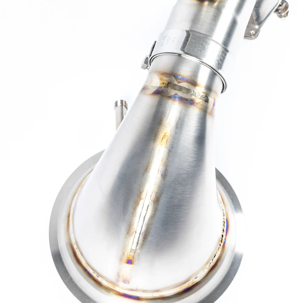 The JCR Titanium Race Pipe (Valved) is a premium mid-section exhaust upgrade engineered for Porsche 992 GT3, GT3 Touring, GT3 RS, and 992 S/T models. Built from high-grade titanium with an Inconel valve section, this race-inspired pipe replaces the restrictive factory pipe downstream of the OPF (exhaust particulate filter) to unleash a more dynamic exhaust note, reduced weight, and real performance gains. By retaining the OEM valve motors and full cabin exhaust valve control, you get a versatile sound profile: refined and comfortable with valves closed, or aggressive, free-flowing, and track-ready with valves open. Extensive development ensures optimized backpressure and tone throughout the RPM range — right up to 9,000 rpm.
