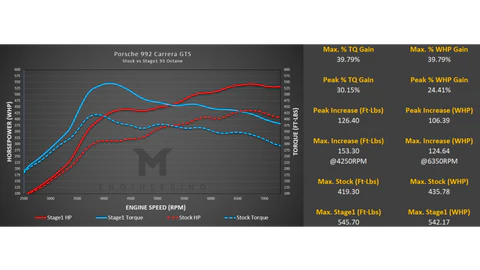 Significant Power Gains: Engine calibrations increase horsepower and torque across the rev range — for example, Stage 1 tuning on a 992 Carrera Base can add ~+61 WHP and +106 lb-ft torque on 93 octane fuel.