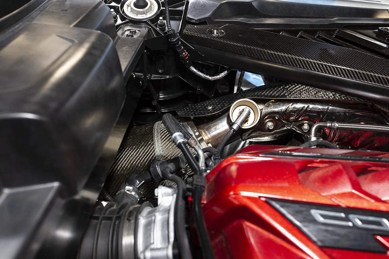CONSTRUCTION: Each set is assembled in house in the USA out of mandrel bent, thick wall .065″” T304L stainless steel. Back purged TIG welding ensures proper weld penetration and longevity. We fabricate these cats using thick gauge aluminum fixtures which act as a great heat sink during the welding process and prevent warping not only of our products, but the fixtures themselves to ensure perfect fitment. Due to the close proximity of the catalytic converters to sensitive components, heat shields are a MUST with the C8! We’ve partnered with PTP Turbo Blankets to produce a bespoke, form-fitting heat shielding solution. Far superior to no-name brand copies, PTP Lava Turbo Blankets are constructed with an outer layer made from pulverized volcanic lava rock (Rated 1800°F Direct Heat / 2500°F Radiant Heat) formed into fabric and woven into a tight mesh weave. These blankets are internally insulated with high temperature calcium magnesium silicate wool (Rated 1832°F Continuous / 2300°F Peak) overlaid with a high temperature stainless steel mesh for increased durability and improved thermal resistance. The Lava Blankets are designed to withstand the harshest of conditions.