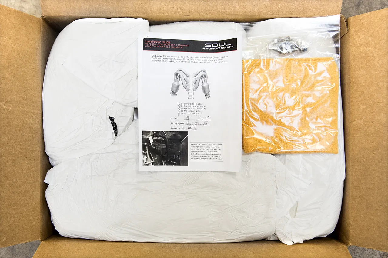 The Soul Performance Long Tube Street Headers for the Porsche 981 Boxster and Cayman (2013–2016) are a premium, performance-oriented header upgrade that dramatically improves exhaust flow, throttle response, and flat-six character. Built around large-diameter, free-flowing catalytic converters and long tube runners that are specifically sized for the 3.4L / 2.7L engines, this system is designed to yield noticeable gains in mid-range power while enhancing exhaust tone versus the restrictive factory manifolds — all without throwing a check engine light on most OBD2 vehicles. These headers offer a more aggressive exhaust note and freer rev-up experience, making them a compelling upgrade for enthusiasts seeking refined performance and sound.