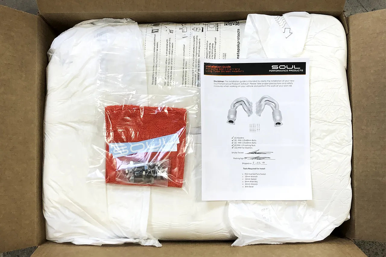 The Soul Performance Long Tube Street Headers for the Porsche 991.1 Carrera (2012–2016) are a precision-engineered exhaust upgrade that replaces the restrictive stock manifolds with long tube headers built around free-flowing catalytic converters to improve throttle response, mid-range torque, and overall engine performance. Designed specifically for the 991.1 platform, these headers use optimized runner sizing and merge technology to enhance exhaust scavenging and deliver a richer, more dynamic flat-six soundtrack at cruise and under load. Independent dyno testing shows meaningful gains in power and torque throughout the rev range, especially in mid-RPMs where street driving spends most of its time. Constructed from premium T304L stainless steel and backed by Soul’s lifetime warranty for street and track use, this set offers a significant performance step up without sacrificing reliability.