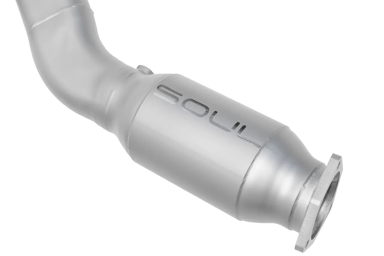 The SOUL Resonated Over‑Axle Pipes for the 718 GT4 RS / Spyder RS discard the stock restrictive over‑axle pipes (with redundant cats/filters) and replace them with a full‑3‑inch, mandrel‑bent stainless exhaust flow path — significantly improving exhaust flow and sound while reducing unsprung/rotating mass. These resonated pipes give a refined yet aggressive exhaust note, delivering a balanced performance upgrade that enhances throttle response, reduces exhaust restriction, and tames drone for streetable usability. With improved flow and lighter weight, they unlock more of the flat‑six’s potential under both spirited driving and regular use.